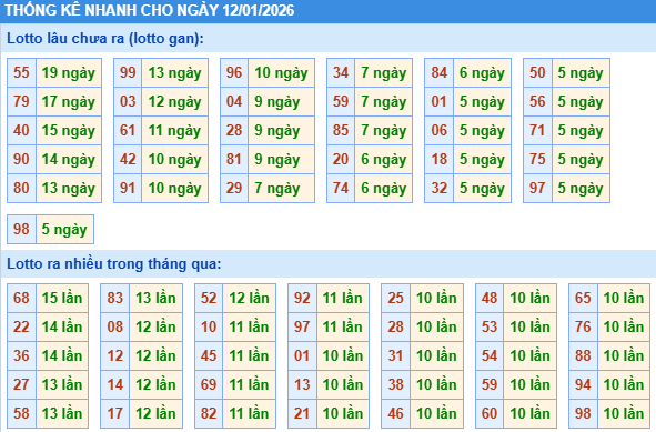 Thống kê miền Bắc hôm nay sẽ đưa ra cho người chơi những bộ số về trong thời gian gần đây để lựa chọn cặp số may mắn ngày 12/01/2026, cụ thể: