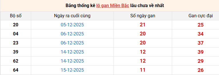Bảng lô gan miền Bắc lâu chưa về tính đến 27/12/2025