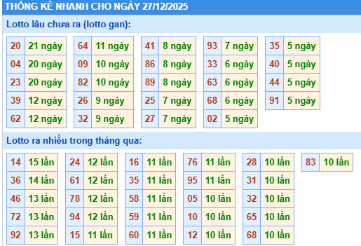 Thống kê miền Bắc hôm nay sẽ đưa ra cho người chơi những bộ số về trong thời gian gần đây để lựa chọn cặp số may mắn ngày 27/12/2025, cụ thể: