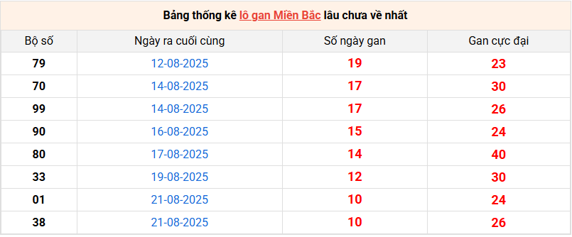Bảng lô gan miền Bắc lâu chưa về tính đến 01/9/2025