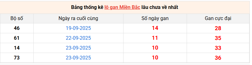 Bảng lô gan miền Bắc lâu chưa về tính đến 04/10/2025