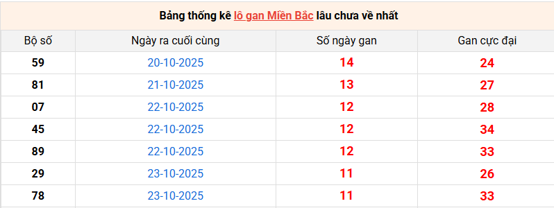 Bảng lô gan miền Bắc lâu chưa về tính đến 04/11/2025