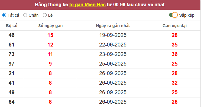 Bảng lô gan miền Bắc lâu chưa về tính đến 05/10/2025