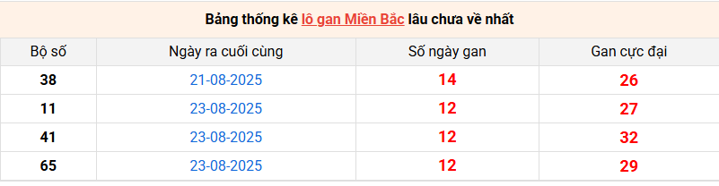 Bảng lô gan miền Bắc lâu chưa về tính đến 05/9/2025