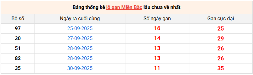 Bảng lô gan miền Bắc lâu chưa về tính đến 12/10/2025
