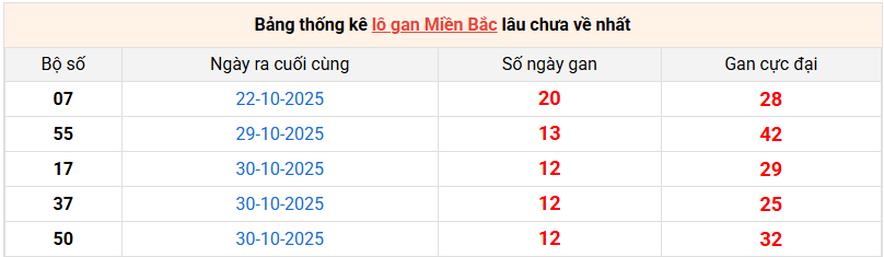 Bảng lô gan miền Bắc lâu chưa về tính đến 12/11/2025