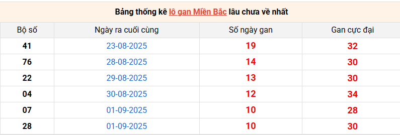 Bảng lô gan miền Bắc lâu chưa về tính đến 12/9/2025