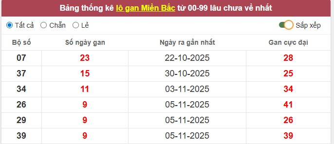 Bảng lô gan miền Bắc lâu chưa về tính đến 15/11/2025