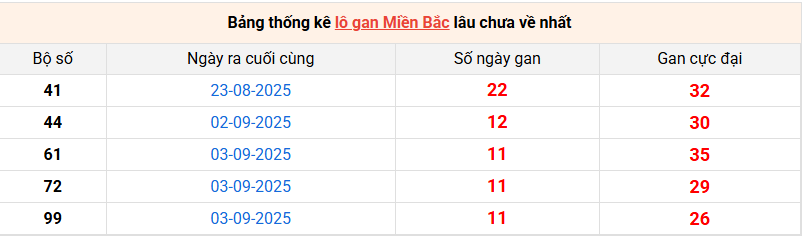 Bảng lô gan miền Bắc lâu chưa về tính đến 15/9/2025