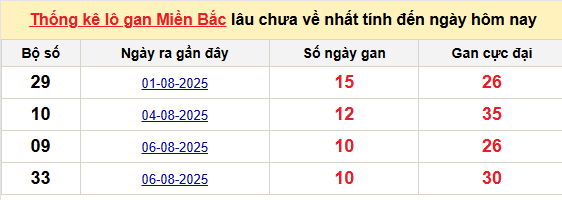 Bảng lô gan miền Bắc lâu chưa về tính đến 17/8/2025
