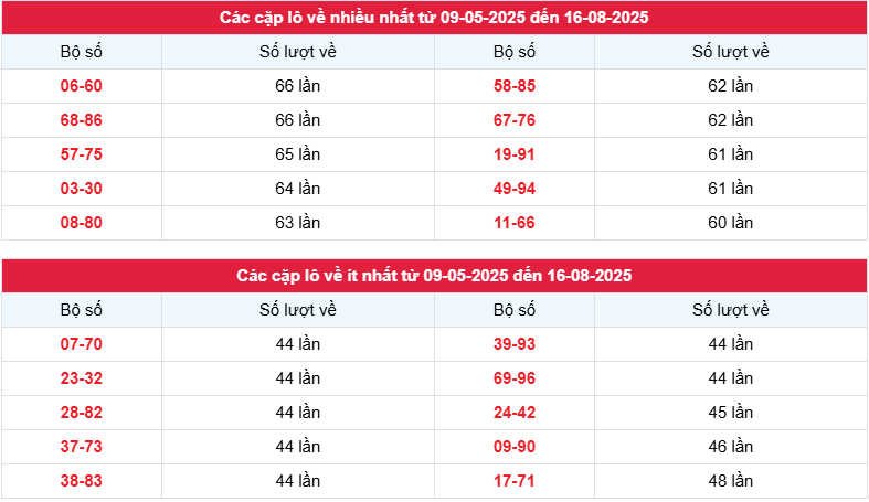 Thống kê miền Bắc hôm nay sẽ đưa ra cho người chơi những bộ số về trong thời gian gần đây để lựa chọn cặp số may mắn ngày 17 tháng 8 năm 2025, cụ thể: