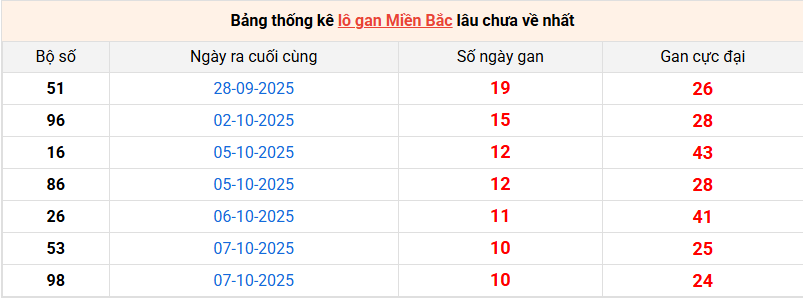 Bảng lô gan miền Bắc lâu chưa về tính đến 18/10/2025