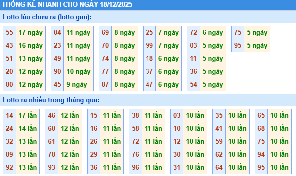 Thống kê miền Bắc hôm nay sẽ đưa ra cho người chơi những bộ số về trong thời gian gần đây để lựa chọn cặp số may mắn ngày 18/12/2025, cụ thể: