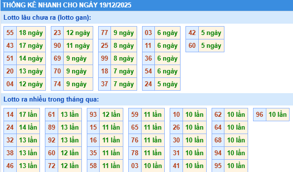 Thống kê miền Bắc hôm nay sẽ đưa ra cho người chơi những bộ số về trong thời gian gần đây để lựa chọn cặp số may mắn ngày 19/12/2025, cụ thể: