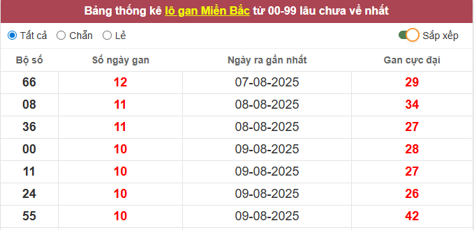 Bảng lô gan miền Bắc lâu chưa về tính đến 20/8/2025