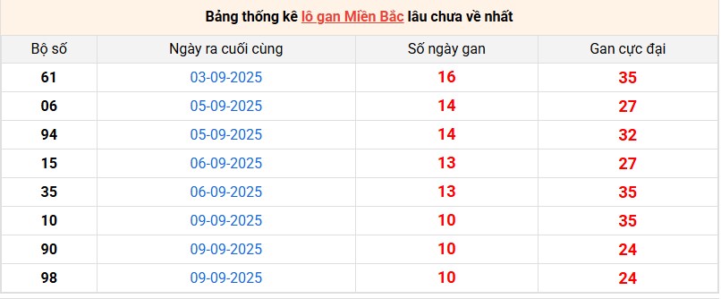Bảng lô gan miền Bắc lâu chưa về tính đến 20/9/2025