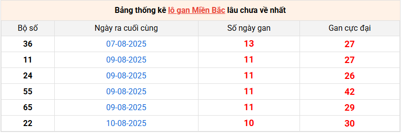 Bảng lô gan miền Bắc lâu chưa về tính đến 21/8/2025