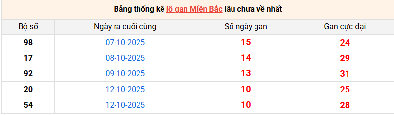 Bảng lô gan miền Bắc lâu chưa về tính đến 23/10/2025