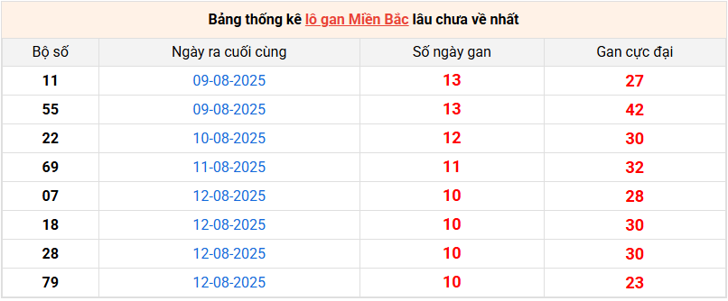 Bảng lô gan miền Bắc lâu chưa về tính đến 23/8/2025