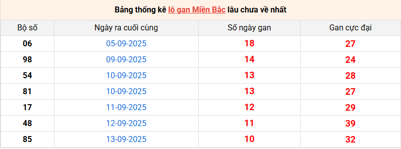 Bảng lô gan miền Bắc lâu chưa về tính đến 24/9/2025
