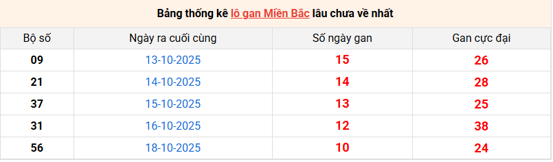 Bảng lô gan miền Bắc lâu chưa về tính đến 29/10/2025