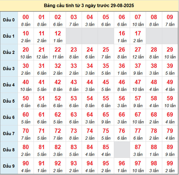 Bảng tần suất loto miền Bắc 29/8