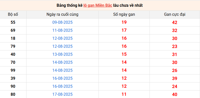 Bảng lô gan miền Bắc lâu chưa về tính đến 29/8/2025