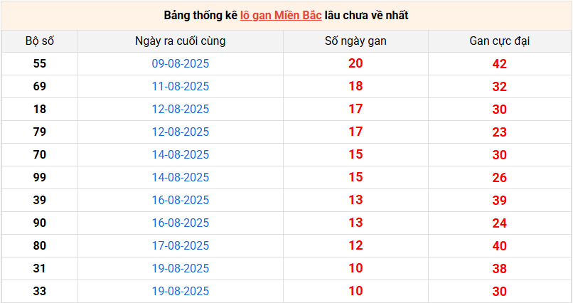 Bảng lô gan miền Bắc lâu chưa về tính đến 30/8/2025