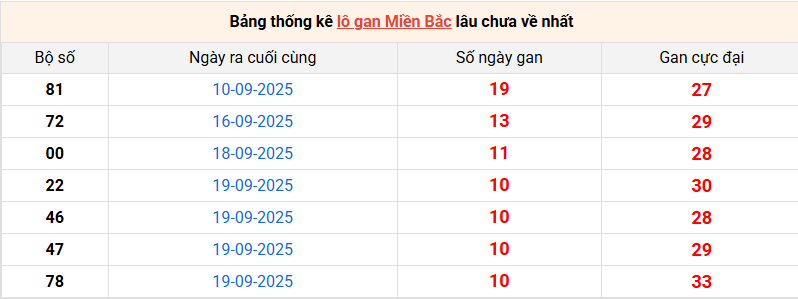 Bảng lô gan miền Bắc lâu chưa về tính đến 30/9/2025