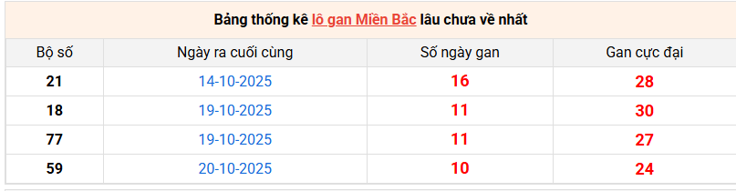 Bảng lô gan miền Bắc lâu chưa về tính đến 31/10/2025