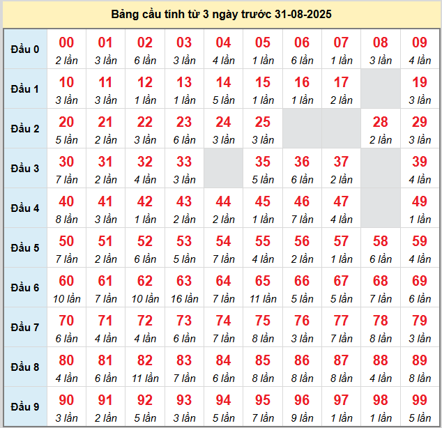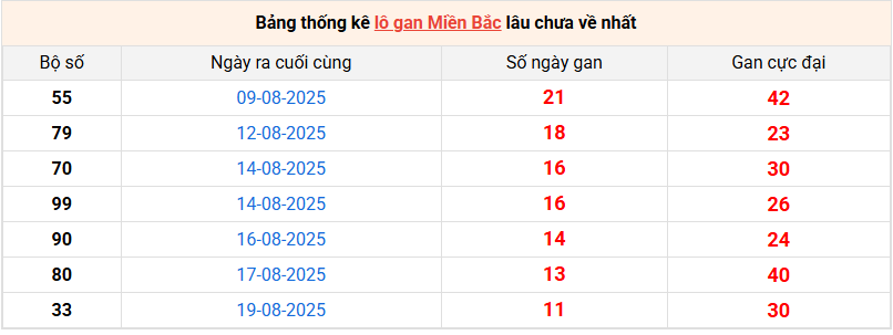 Bảng lô gan miền Bắc lâu chưa về tính đến 31/8/2025