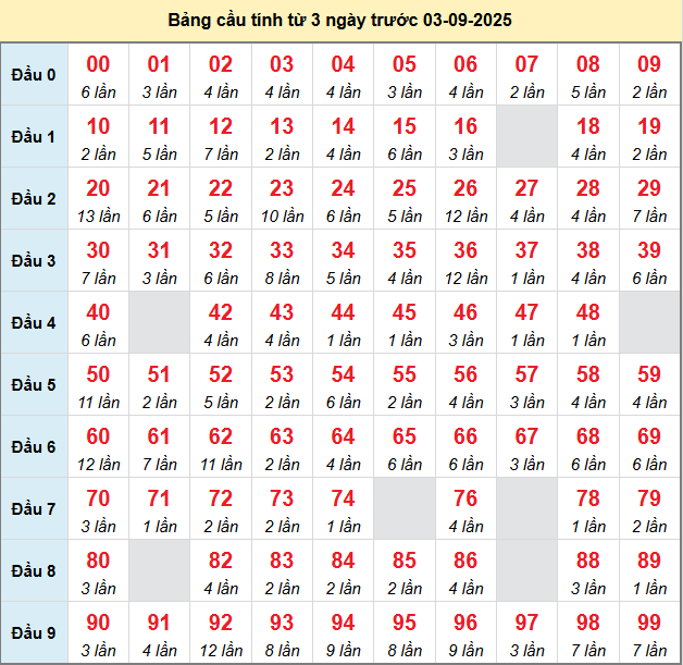 Bảng tần suất loto miền Bắc 03/9