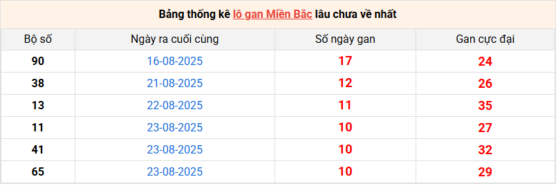 Bảng lô gan miền Bắc lâu chưa về tính đến 03/9/2025