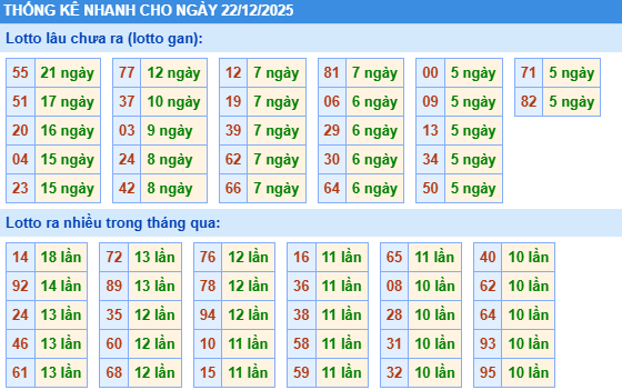 Thống kê miền Bắc hôm nay sẽ đưa ra cho người chơi những bộ số về trong thời gian gần đây để lựa chọn cặp số may mắn ngày 22/12/2025, cụ thể: