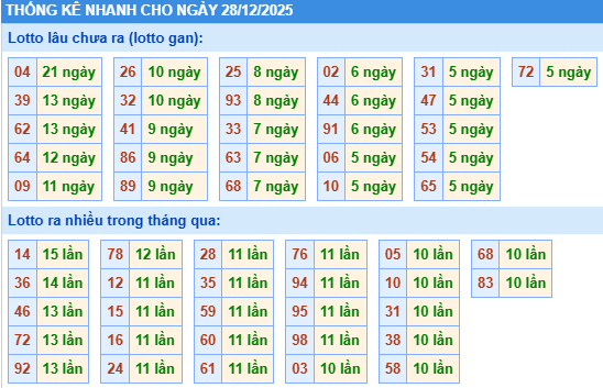 Thống kê miền Bắc hôm nay sẽ đưa ra cho người chơi những bộ số về trong thời gian gần đây để lựa chọn cặp số may mắn ngày 28/12/2025, cụ thể: