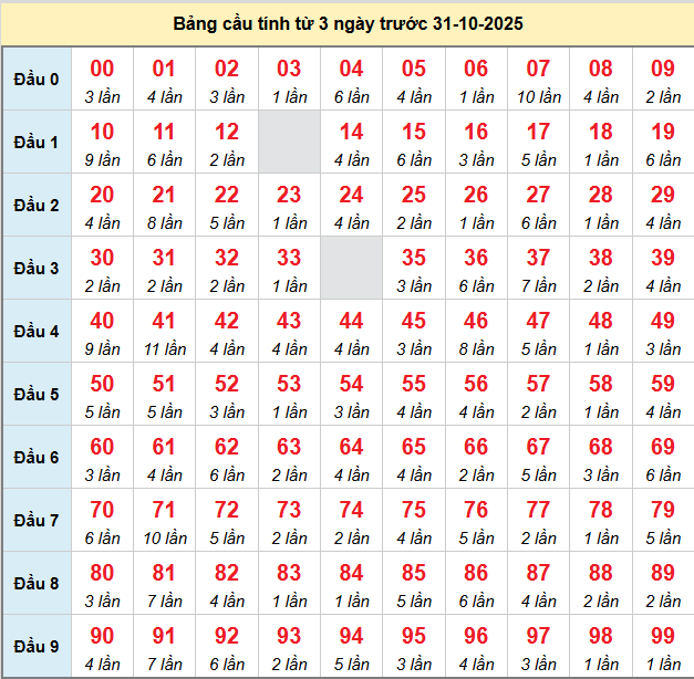 Bảng lô gan miền Bắc lâu chưa về tính đến 31/10/2025